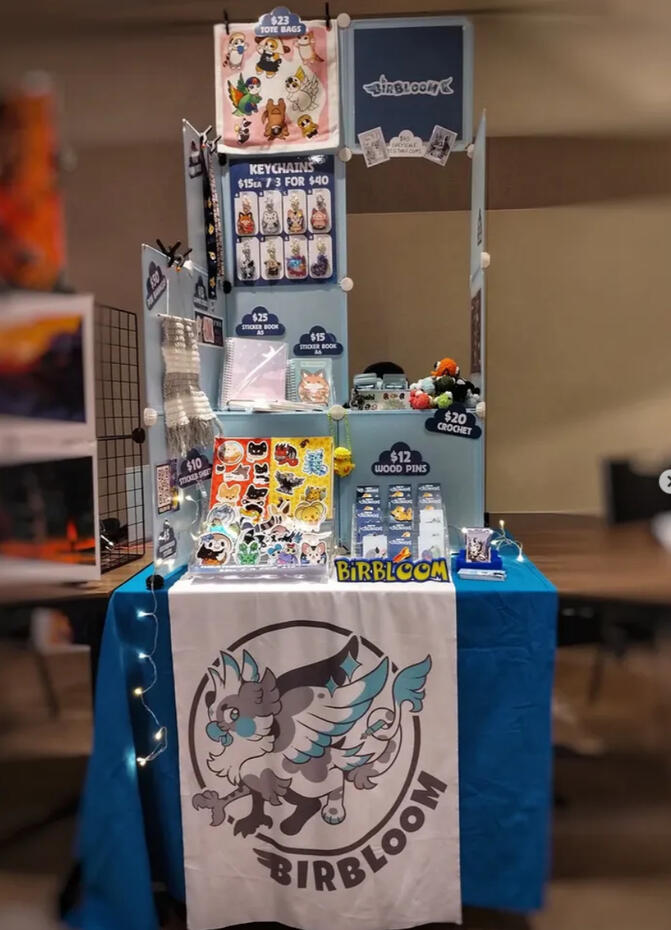 Currently, they stream weekly on Twitch and small drawing commissions are available through the ko-fi platform. Graphic design jobs can be discussed on a case-by-case basis over email.Birbloom's mission is to continually improve their skills and use their work to connect and collaborate with more artists. Their vision is to use the proceeds of selling their products at local markets and conventions in order to fund more ambitious artistic projects.Previous Events